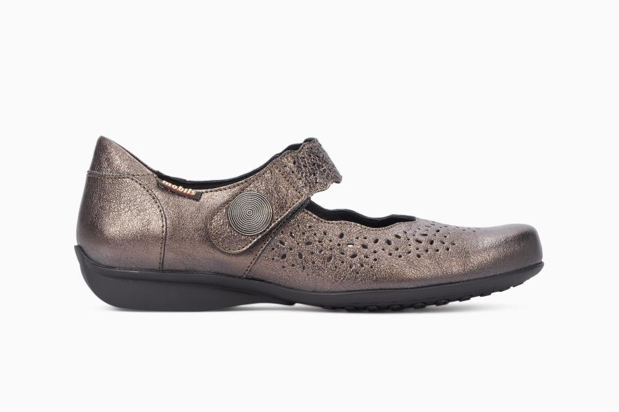Ballerine à bride femme - Cuir métallisé, Taupe Foncé. Cette chaussure allie confort optimal et finesse avec les perforations sur l'avant. La bride auto-agrippante ajustable, finement perforée, et le matelassage intégral offrent un excellent chaussant. La semelle amovible qui intègre la SOFT-AIR Technologie réduit les chocs au minimum, pour une marche tout en douceur et sans fatigue. Cette chaussure est conçue avec un supplément de largeur et offre ainsi plus de place à l’avant des chaussures. Pour une coupe parfaite et un confort incomparable.