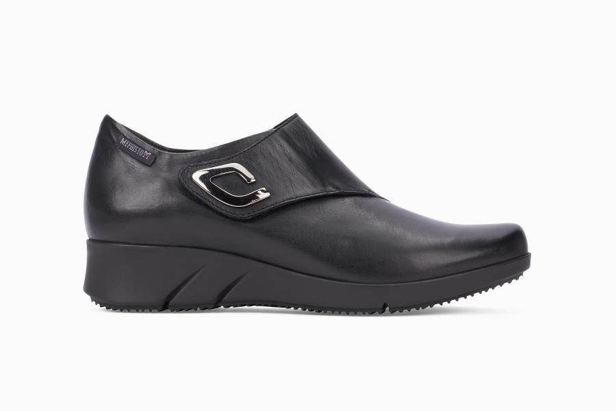 Chaussure à scratch femme - Cuir lisse, Noir. Facile à chausser grâce à la bride scratch sur le cou-de-pied, cette chaussures à talon compensé offre un excellent chaussant. La voûte amovible qui intègre la Soft-Air Technologie et l'absorbeur de chocs présent dans la semelle 100% caoutchouc, réduisent les chocs au minimum pour une marche souple et sans fatigue. La doublure en cuir offre un climat sain à l'intérieur de la chaussure.