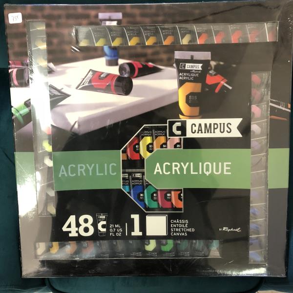 Le coffret comprend 48 petits tubes de peinture acrylique (21ml) et un châssis