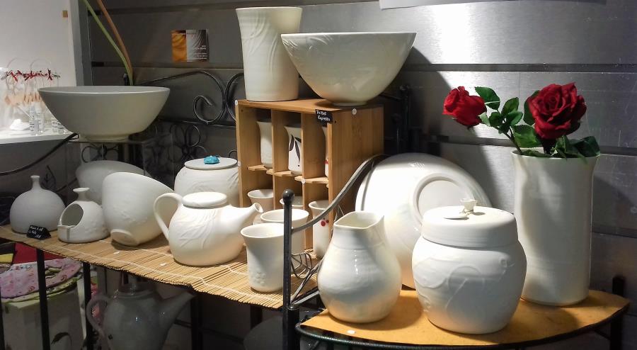 Porcelaine provenant de Lépinas. Toutes ces créations sont entièrement réalisées à la main en utilisant une technique de réserves, appelé "gravure à l'eau". L'artisane peut obtenir des bas-reliefs au plus près de ses graphismes et aller vers davantage de translucidité.