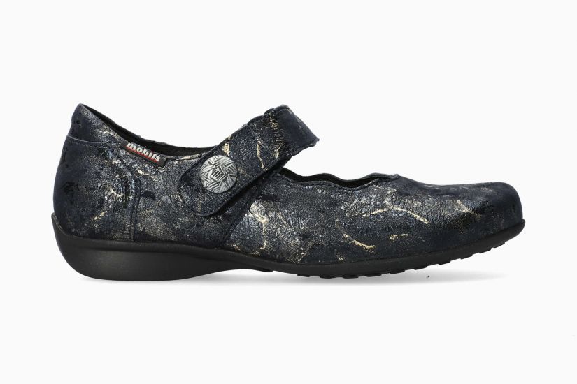 Cette ballerine à la fois classique et féminine, associée à la souplesse de sa semelle en caoutchouc, reflète une élégance intemporelle. La doublure en cuir assure une hygiène saine du pied. Cette ballerine bleue pour femme est composée de cuir effet métallisé impression fantaisie.