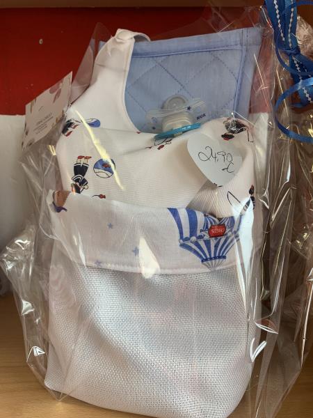 Joli petit panier réutilisable cousu mains + drap housse de berceau ou petit lit 60/120 cm + 1 bavoir doublé cousu main + pochette composée d’une alèse + 1 tétine.